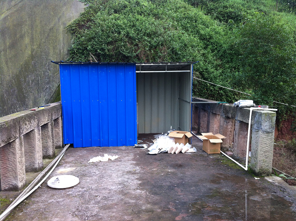 ??3、站在堤壩彩鋼棚拍攝。上面根管為新安裝的PPR管(相對(duì)固定,耐用),約150米,終端為塑料軟管(便于隨時(shí)拉動(dòng),不耐用),根據(jù)垃圾堆放距離可隨時(shí)增加。??