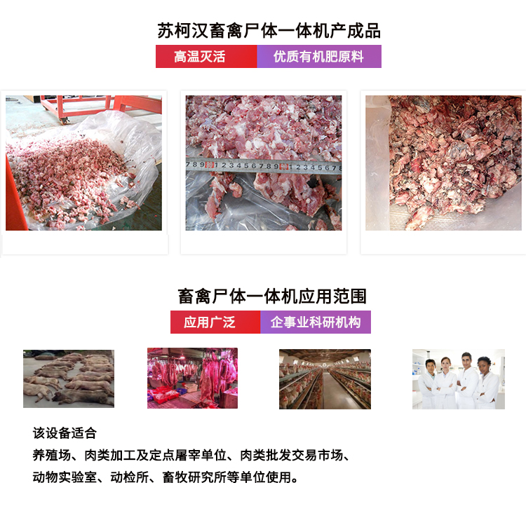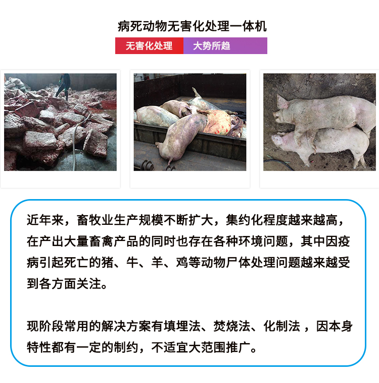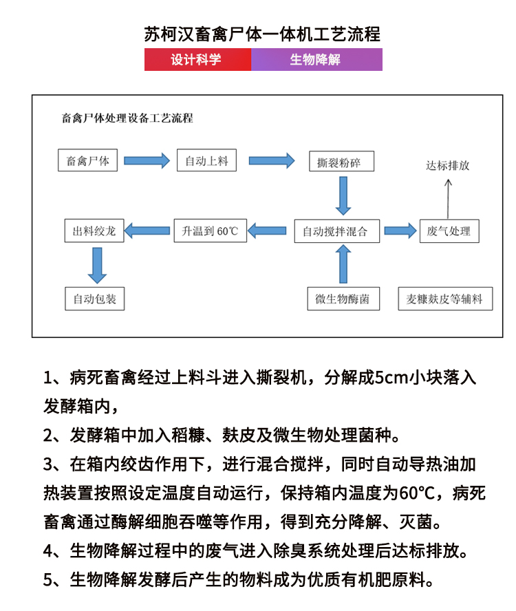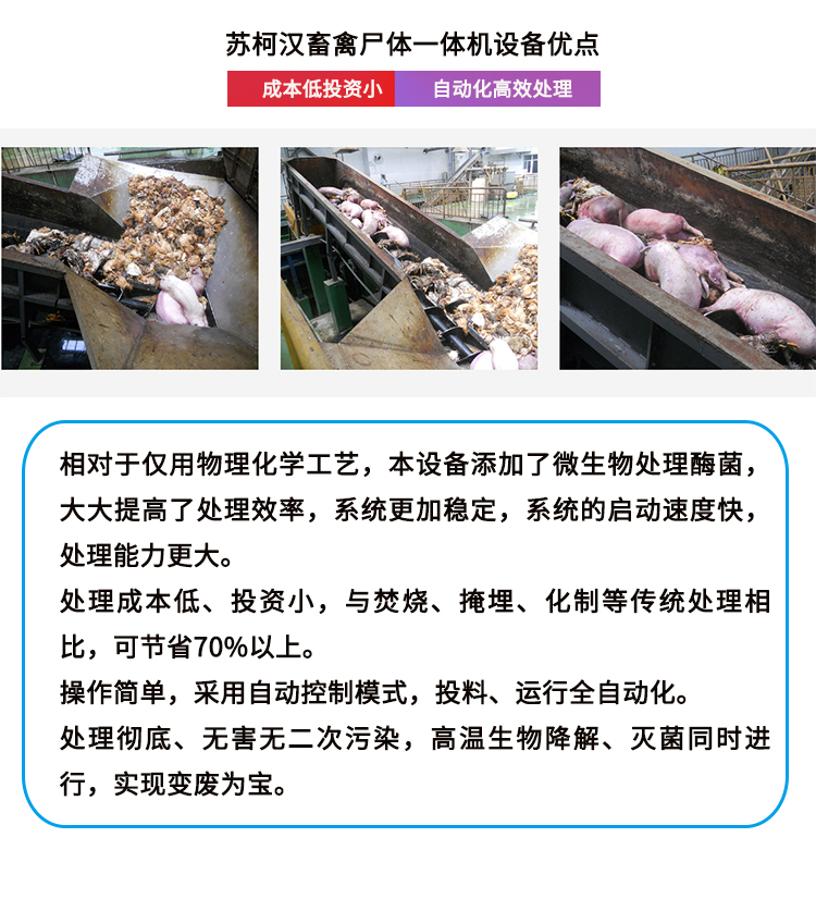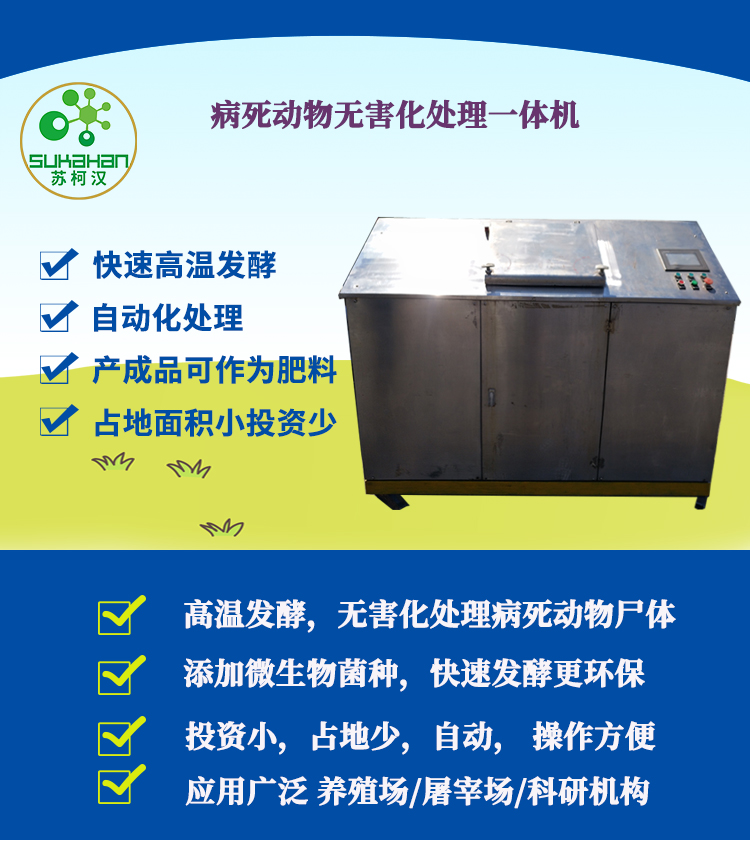 高溫發(fā)酵,無(wú)害化處理病死動(dòng)物尸體 添加微生物菌種,快速發(fā)酵更環(huán)保 投資小,占地少,自動(dòng), 操作方便 應(yīng)用廣泛 養(yǎng)殖場(chǎng)/屠宰場(chǎng)/科研機(jī)構(gòu)