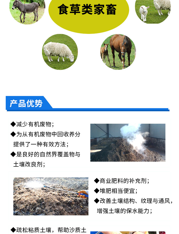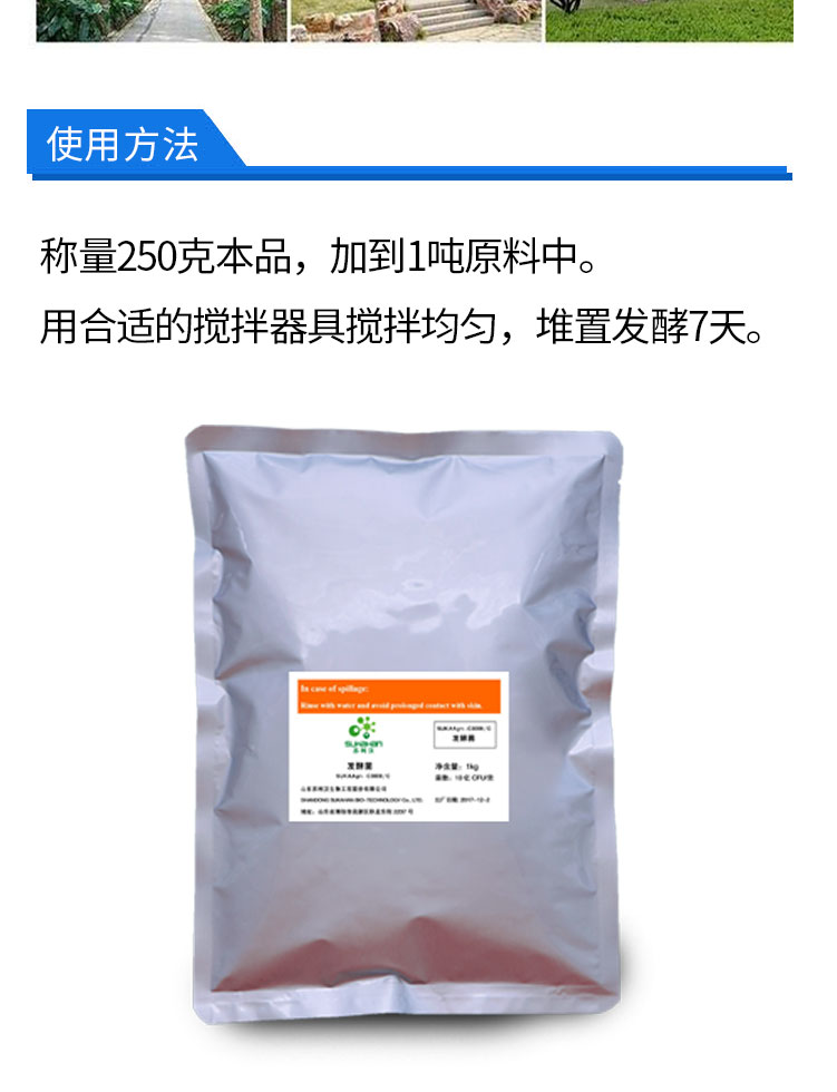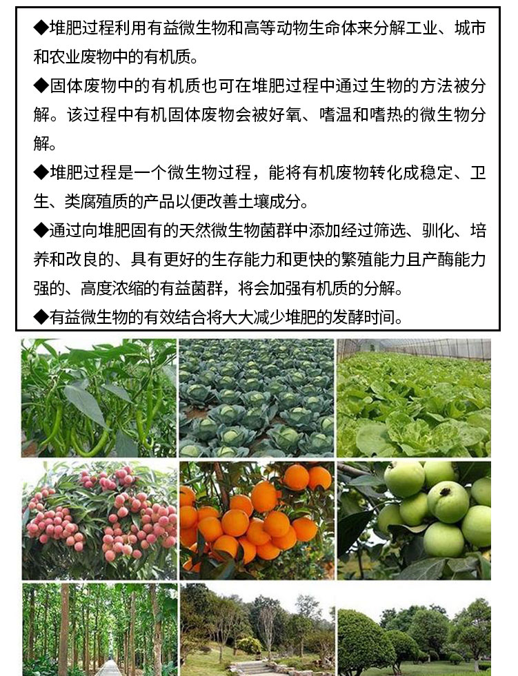 在堆肥過程中添加本濃縮產(chǎn)品以補(bǔ)充原始菌種,并加強(qiáng)對有機(jī)質(zhì)的分解以便利用纖維素和農(nóng)業(yè)固體廢物生產(chǎn)腐殖質(zhì)堆肥。